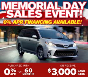 Purchase a 2019 Toyota Sienna with 0% APR for 60 months or receive $3,000 Cash Back.