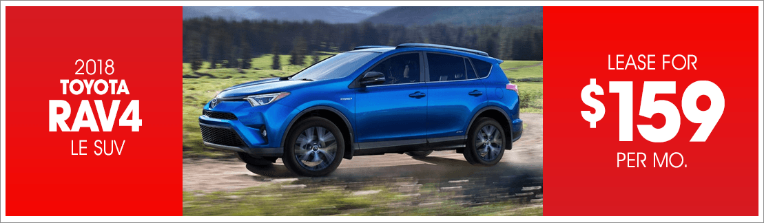 Lease a New 2018 Toyota RAV4 LE SUV for only $159 per month. Click here to view all eligible vehicles.