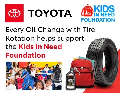 From August 1-31, 2022, Toyota will donate $3.00 to the Kids In Need Foundation for every paid oil change using Genuine Toyota Motor Oil with a tire rotation, with a guaranteed minimum donation of $500,000.