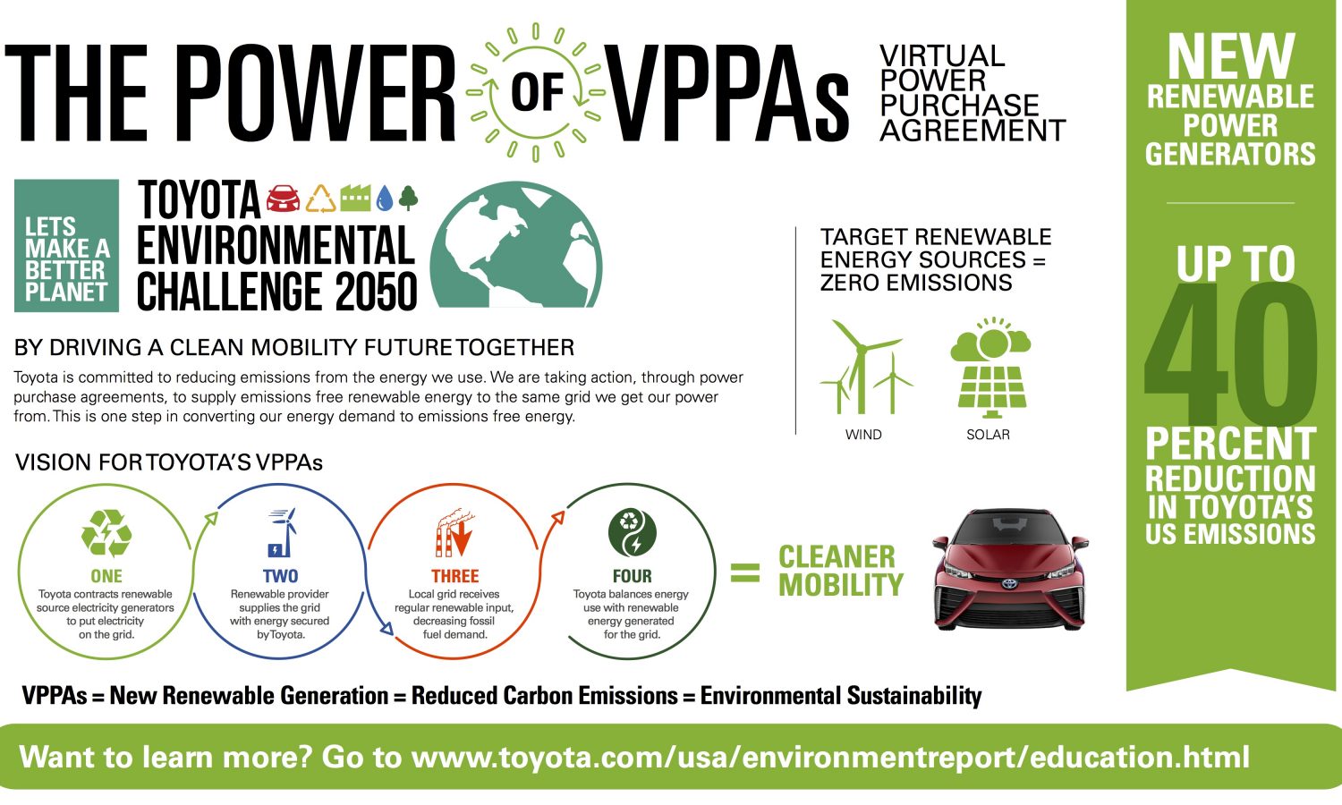 Toyota Motor North America (TMNA) is committing to aggressively reduce its carbon output in the United States by entering into Virtual Power Purchase Agreements (VPPAs). It will use them to reduce emissions from its North American operations by up to forty percent over the next 3 years.