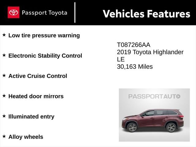 With a list price of $26,990, this 2019 Toyota Highlander LE represents an exceptional opportunity to own a well-equipped, low-mileage SUV at a competitive price. Don't miss your chance to make this impressive Highlander your own. Contact us now to learn more and take the first step towards driving home in your dream vehicle.