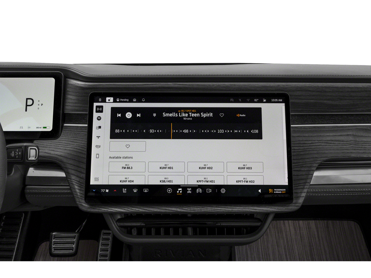 - Radio: Rivian Elevation Audio by Meridian -inc: LTE and Wi-Fi capability, Bluetooth® pairing, wireless inductive charger, up to 8 USB, 2 12V outlets, 2 120V outlets and Alexa voice commands
