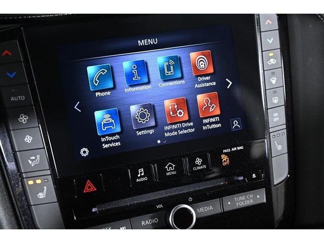 - Radio: HD Audio System -inc: 6 speakers, INFINITI InTouch, INFINITI InTouch services, INFINITI InTouch dual display system w/upper 8" and lower 7" HD touch screens, wireless Apple CarPlay, Android Auto, HD Radio technology, SiriusXM radio w/advanced audio features and 90-day complimentary trial, SiriusXM Travel Link w/90-day complimentary trial, INFINITI voice recognition, Siri Eyes Free, Wi-Fi hotspot, active noise cancellation, Bluetooth® hands-free phone system and streaming audio via Bluetooth®