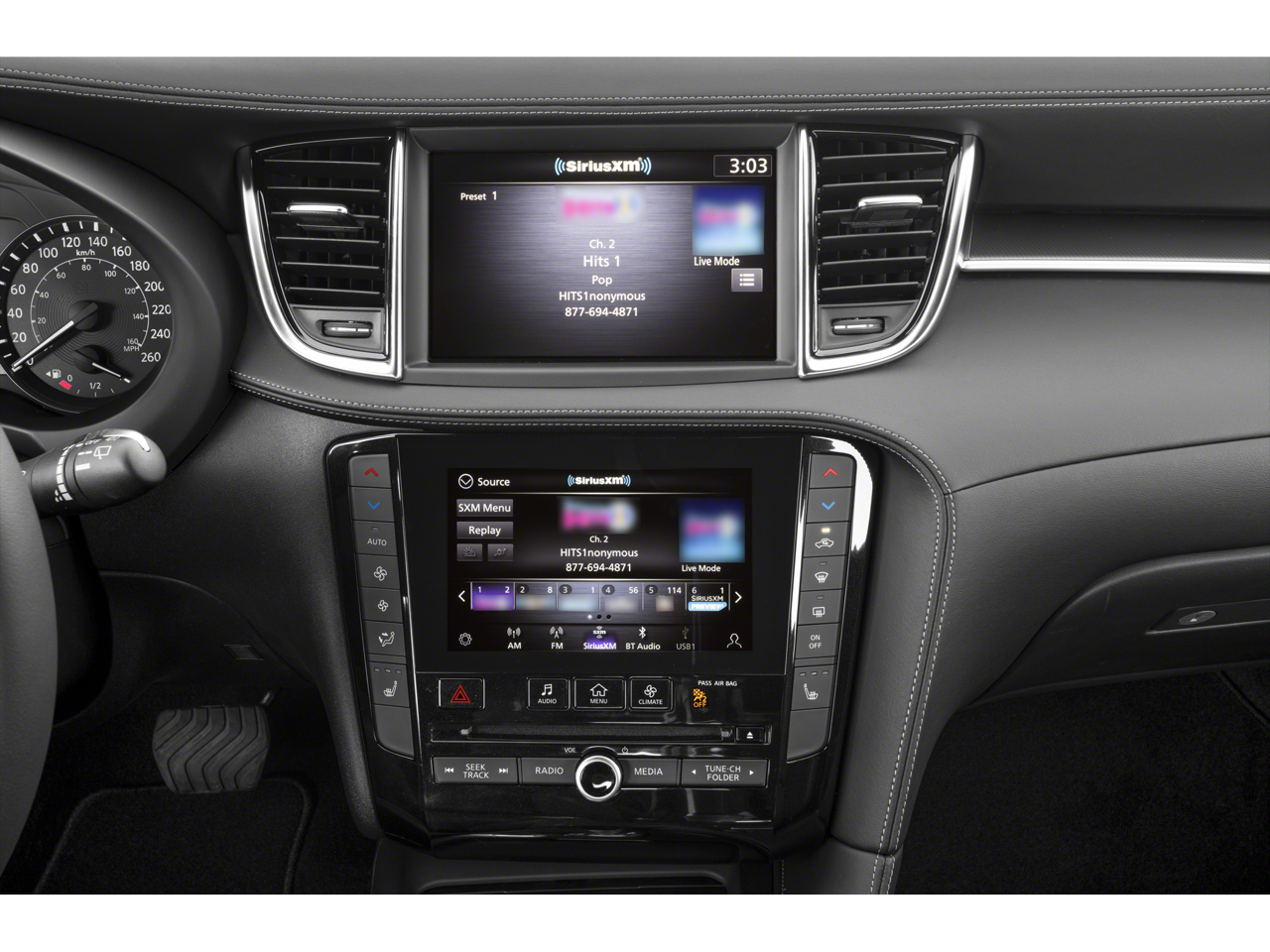- Radio: AM/FM Audio System -inc: 6 speakers, INFINITI InTouch dual display system w/upper 8" and lower 7" HD touch screens, wireless Apple CarPlay, Android Auto, HD Radio technology, SiriusXM radio w/advanced audio features and 90-day complimentary trial, INFINITI voice recognition, INFINITI InTouch services, Siri eyes free and Wi-Fi hotspot