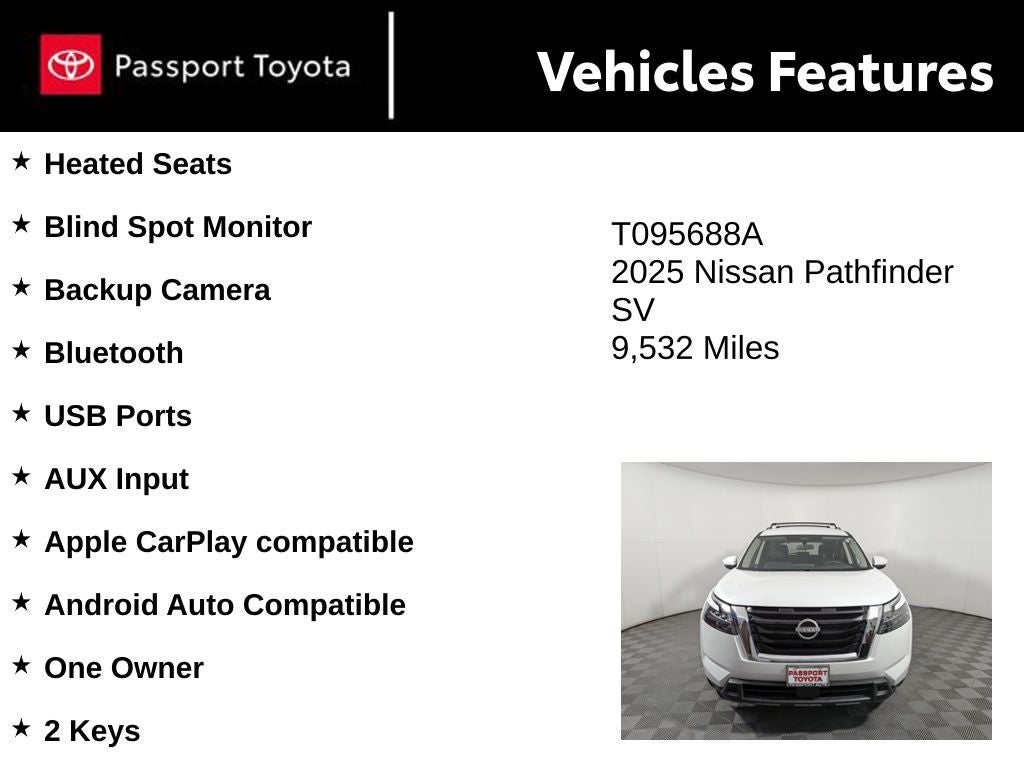 This Pathfinder boasts an impressive array of amenities, including - Android Auto Compatible, Apple CarPlay compatible, Backup Camera, Blind Spot Monitor, Bluetooth®, Cross Bars, Heated Seats, and USB Ports. Additionally, it features PREMIUM PAINT, CROSS BARS, BENCH SEAT CARPETED FLOOR MATS (SET OF 4), and BLACK SPLASH GUARDS (SET OF 4) - all of which add to its exceptional value.